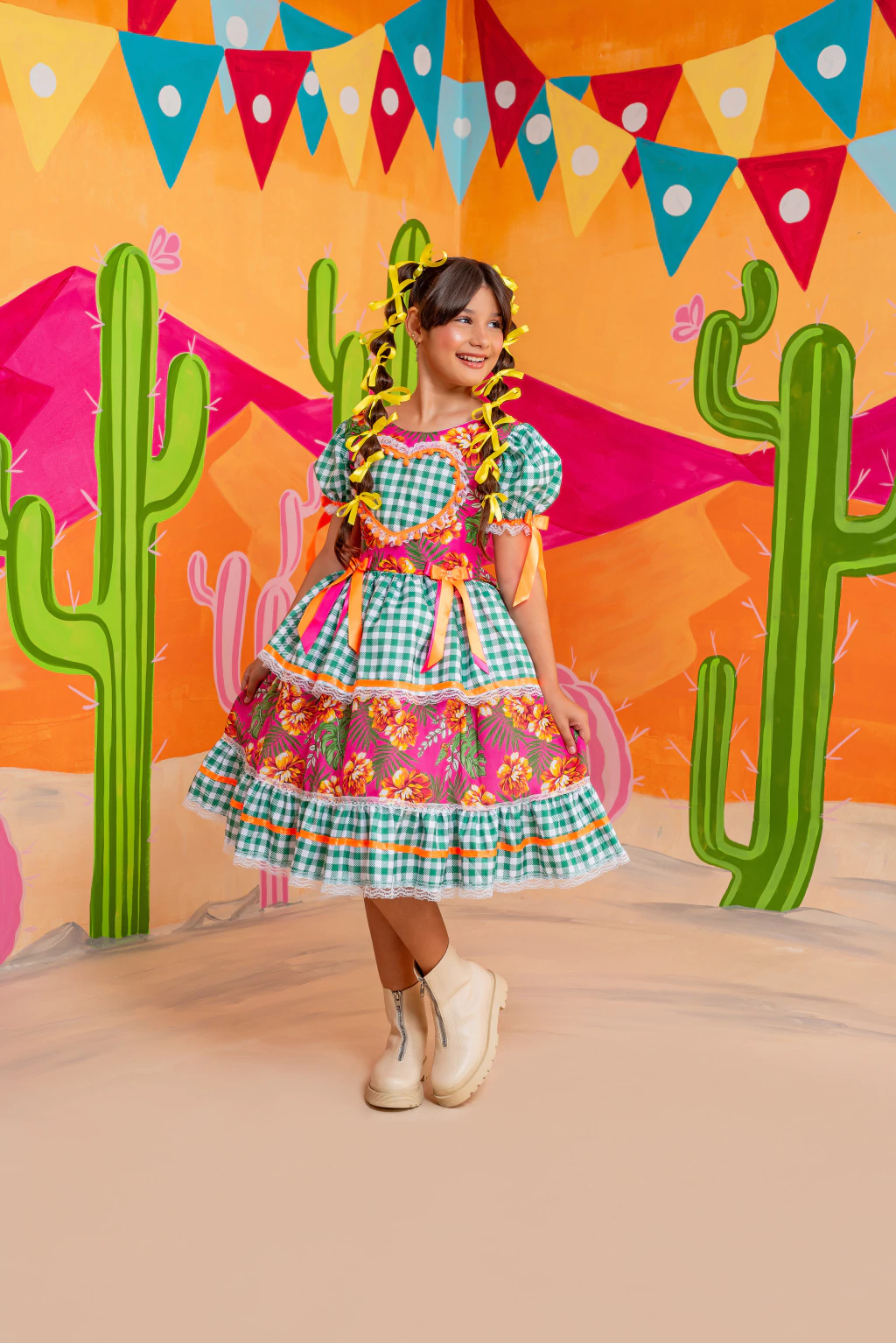 A modelo tem 10 anos e está vestindo tamanho 10 anos.